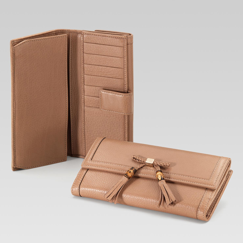 continental wallet with woven leather bow, bamboo detail and tassels.
