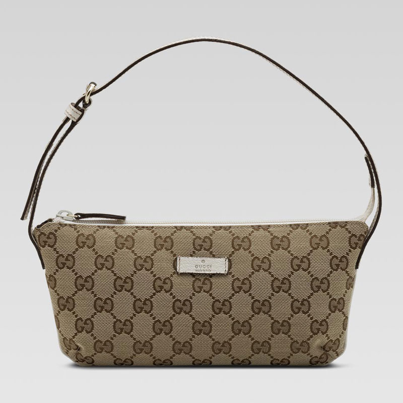-beige/ebony GG fabric with white leather trim-adjustable strap with horsebit ring buckle-zip-top closure