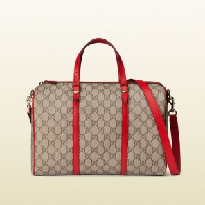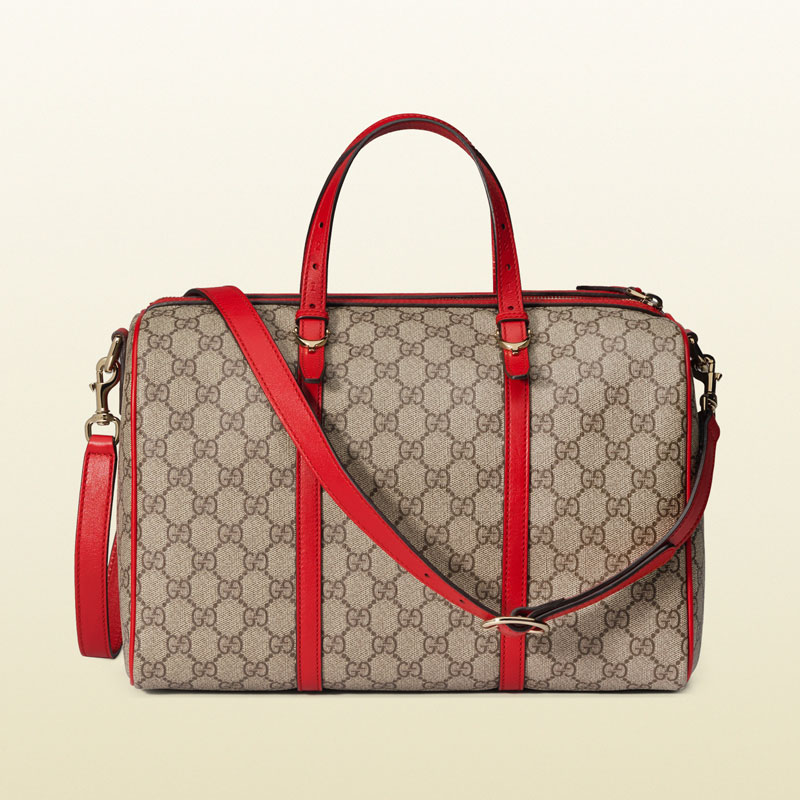 - beige/ebony GG supreme canvas, made using an earth-conscious process, with hibiscus red leather trim