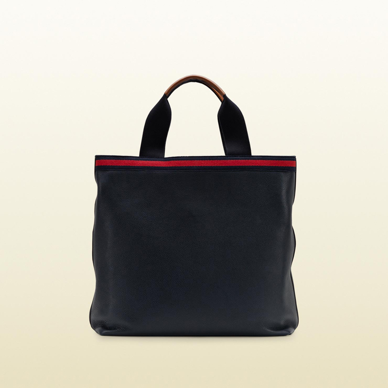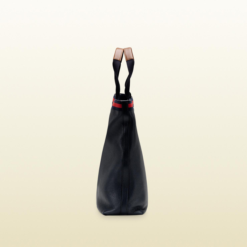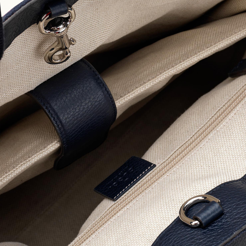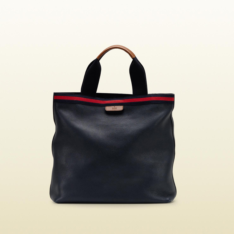 - blue leather with blue/red/blue signature web and cuir color leather trim