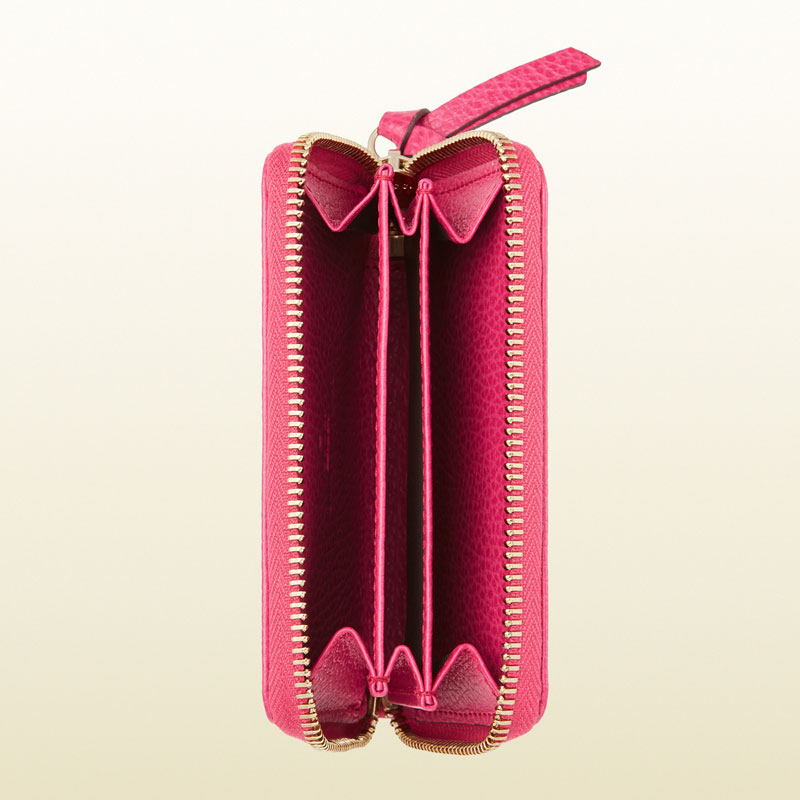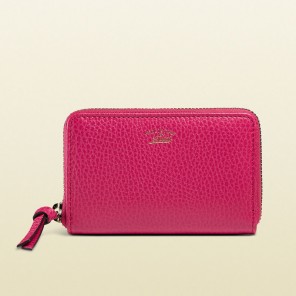 - fuchsia leather- embossed gold gucci trademark- zip around closure- gusseted sides- three compartments- 4.9"W x 3.1"H x 1"D