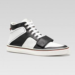 hi-top lace-up sneaker with embossed G script detail on hook-and-loop closure.