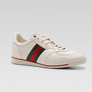 - off-white leather with green/red/green signature web - rubber sole - we recommend sizing down a half size