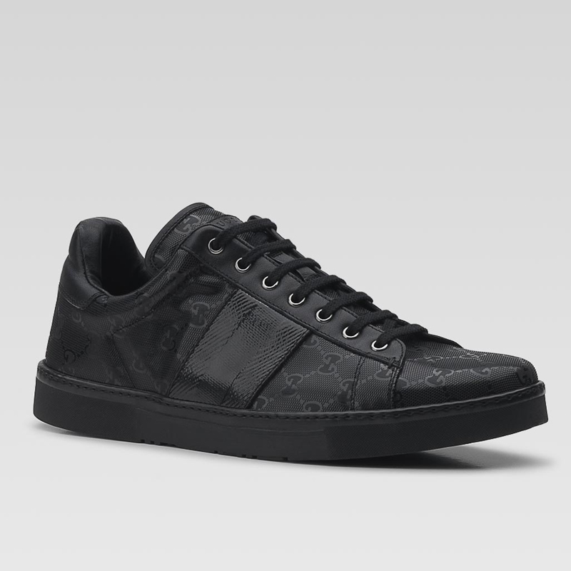 - black GG coated fabric with black leather trim- round toe- rubber sole