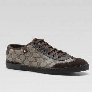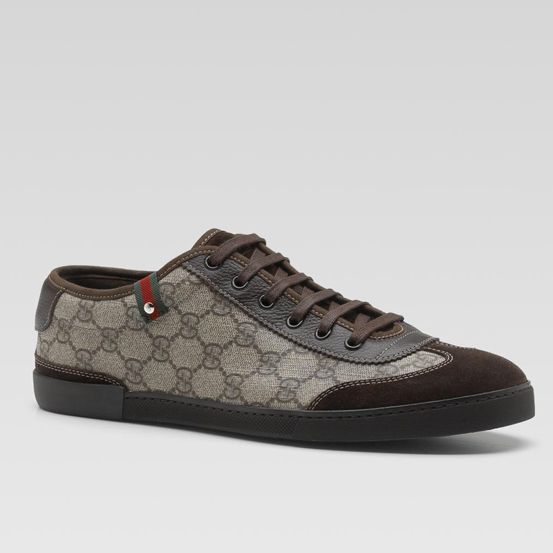- beige/ebony GG plus with dark brown suede and leather trim- green/red/green signature web loop- round toe- rubber sole- we recommend sizing down a half size