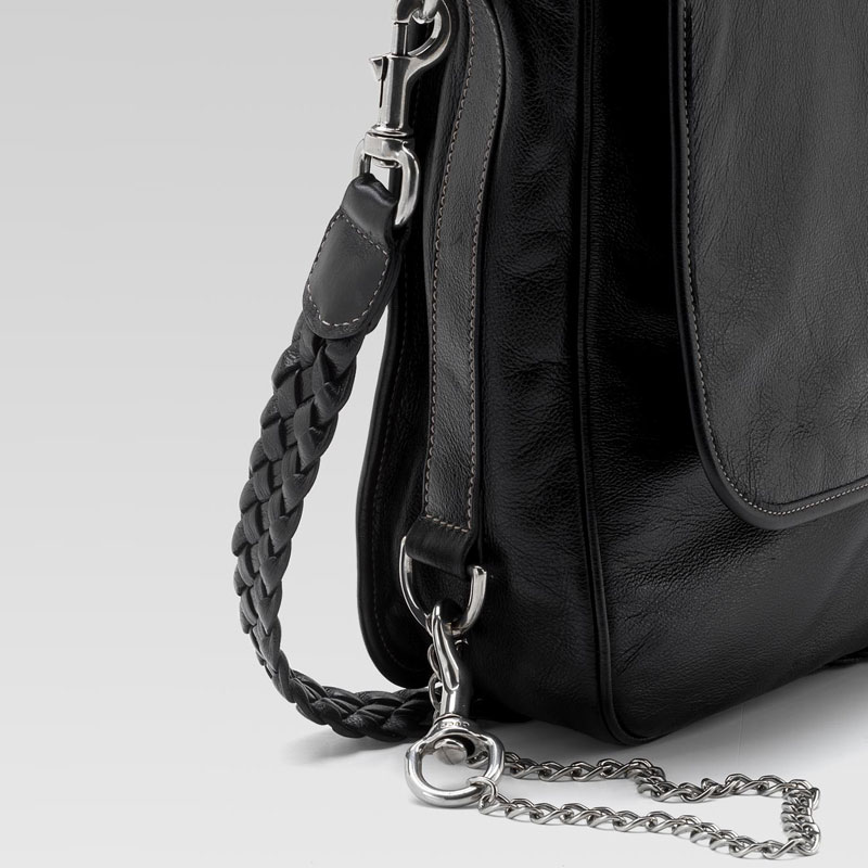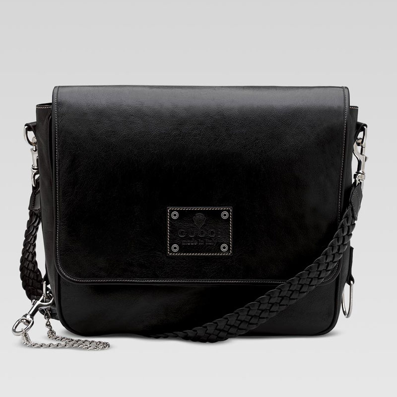 large messenger bag with gucci crest trademark and push lock chain detail.
