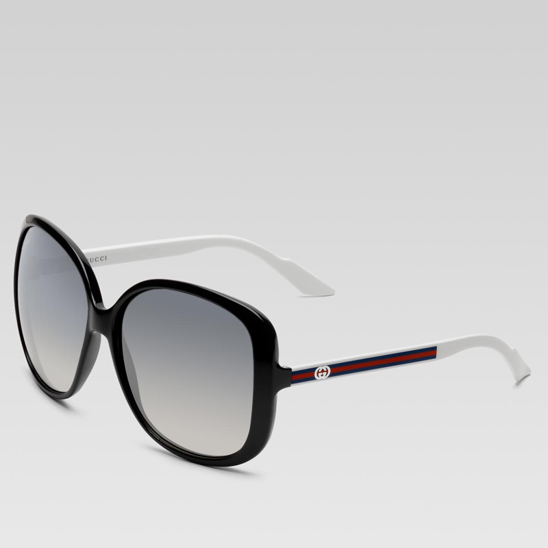 - dark blue and white plastic frame with blue/red/blue web - azure mirrored lens - 100 UVA/UVB protection - GG 3157/S