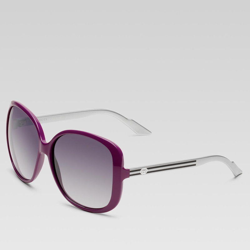 - purple and silver plastic frame with black/silver/black web - grey gradient lens - 100 UVA/UVB protection - GG 3157/S