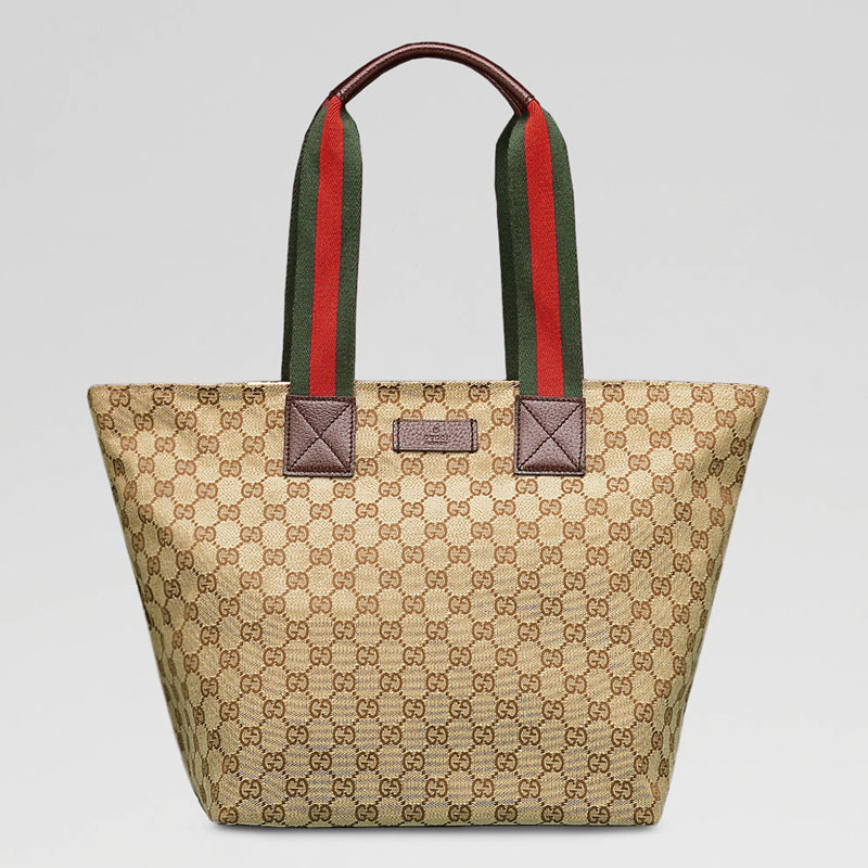 -beige/ebony GG fabric with dark brown leather trim-double handles in green/red/green signature web-zip-top closure