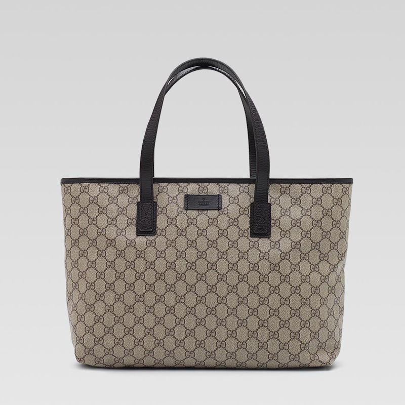 - beige/ebony GG plus with brown leather trim - double shoulder handles - zip-top closure - mobile phone pocket and inside zip pocket
