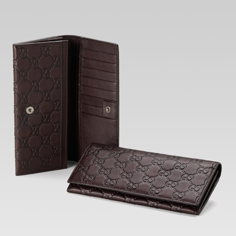- dark brown guccissima leather with dark brown leather trim/interior - snap closure - twelve card slots and three bill compartments - zip coin pocket
