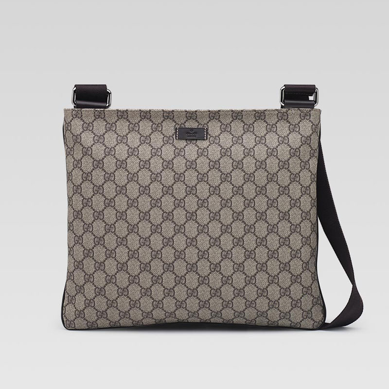 -beige/ebony GG plus with brown leather trim-light gold hardware-single adjustable strap-zip-top closure-inside zip and cell phone pockets