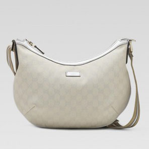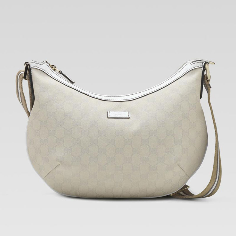 -white GG washed cotton with white leather trim -adjustable shoulder strap in sand/grey/white signature web-zip-top closure
