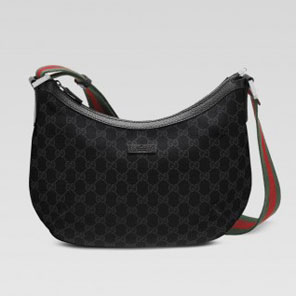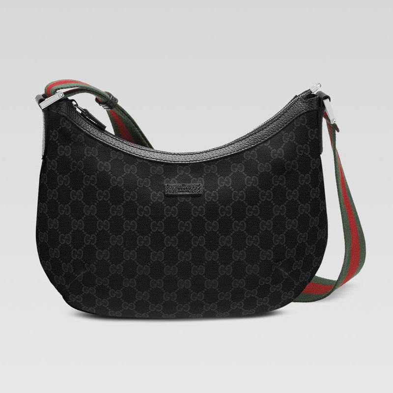 -black GG fabric with black leather trim-adjustable shoulder strap in green/red/green signature web-zip-top closure