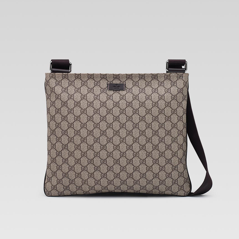 - beige/ebony GG plus with brown leather trim - light gold hardware - adjustable shoulder strap - zip-top closure - inside pocket