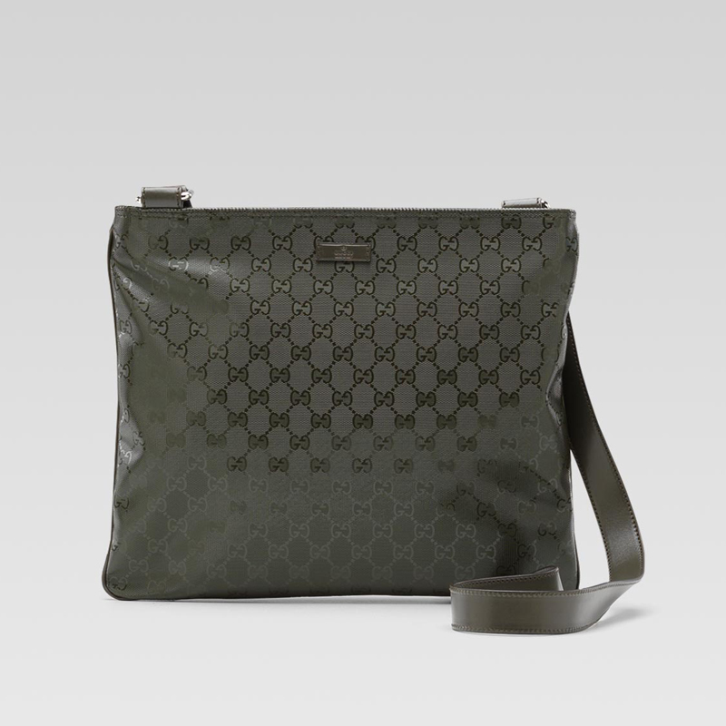- military green GG imprim茅 with military green leather trim - nickel hardware - adjustable shoulder strap - zip-top closure - inside zip and mobile phone pockets
