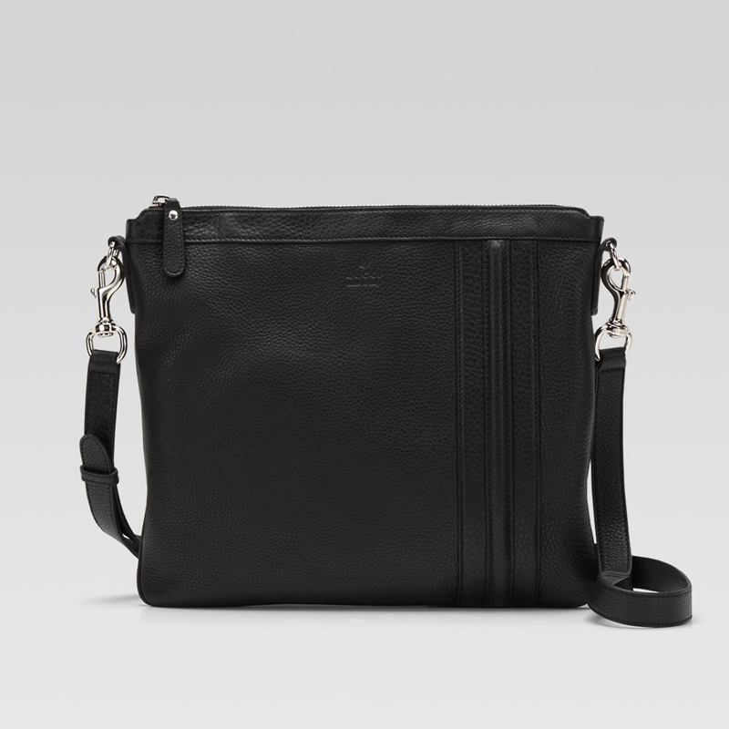 - black leather - nickel hardware - adjustable and detachable shoulder strap - zip-top closure - inside zip, mobile phone, and pda pockets