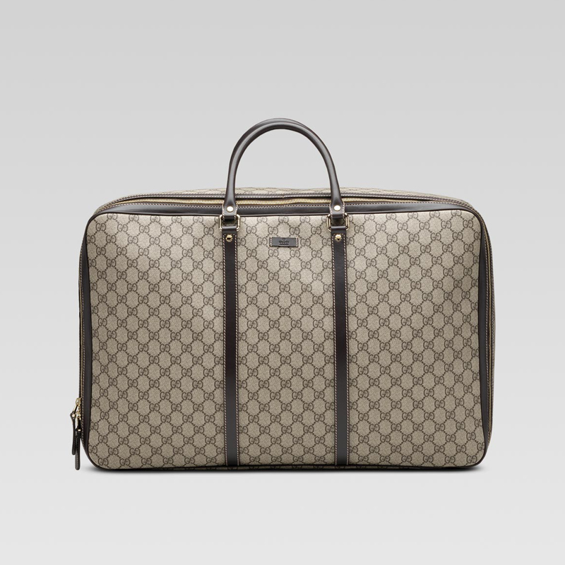 - beige/ebony GG plus with brown leather trim - light gold hardware - double handles - double zip closure with lock - identification tag - inside pocket