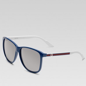 - blue and white plastic frame with blue/red/blue web - light grey mirrored lens - 100% UVA/UVB protection - GG 1636/S
