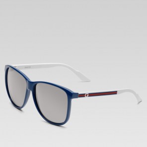 - blue and white plastic frame with blue/red/blue web - light grey mirrored lens - 100% UVA/UVB protection - GG 1636/S