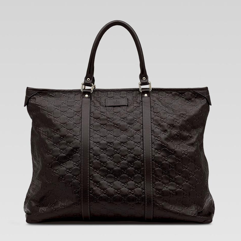 -dark brown guccissima leather with dark brown leather trim-light gold hardware-double handles-zip-top closure-inside zip pocket