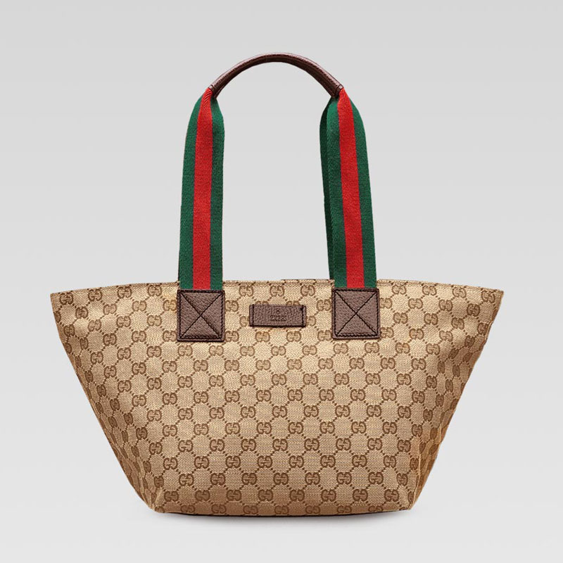 -beige/ebony GG fabric with dark brown leather trim-double handles in green/red/green signature web-zip-top closure-inside and cell phone pockets