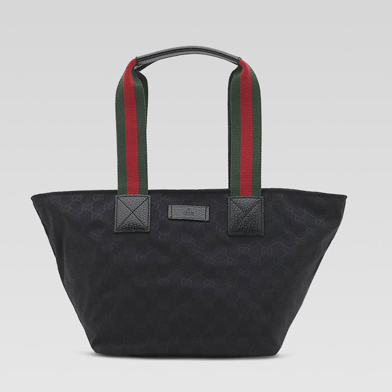 -black GG fabric with black leather trim-double handles in green/red/green signature web-zip-top closure-inside and cell phone pockets