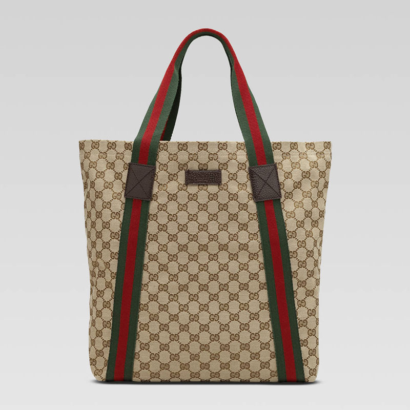 -beige/ebony GG fabric with brown leather trim-double handles in green/red/green signature web -inside and cell phone pockets
