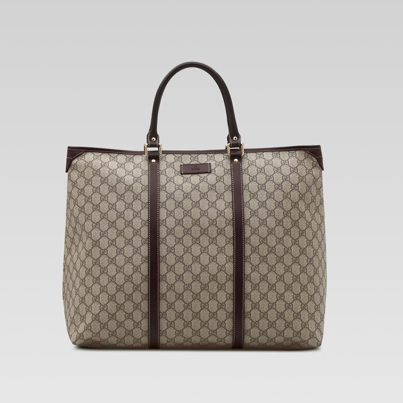 - beige/ebony GG plus with brown leather trim - light gold hardware - double handles - zip-top closure - inside zip and mobile phone pockets