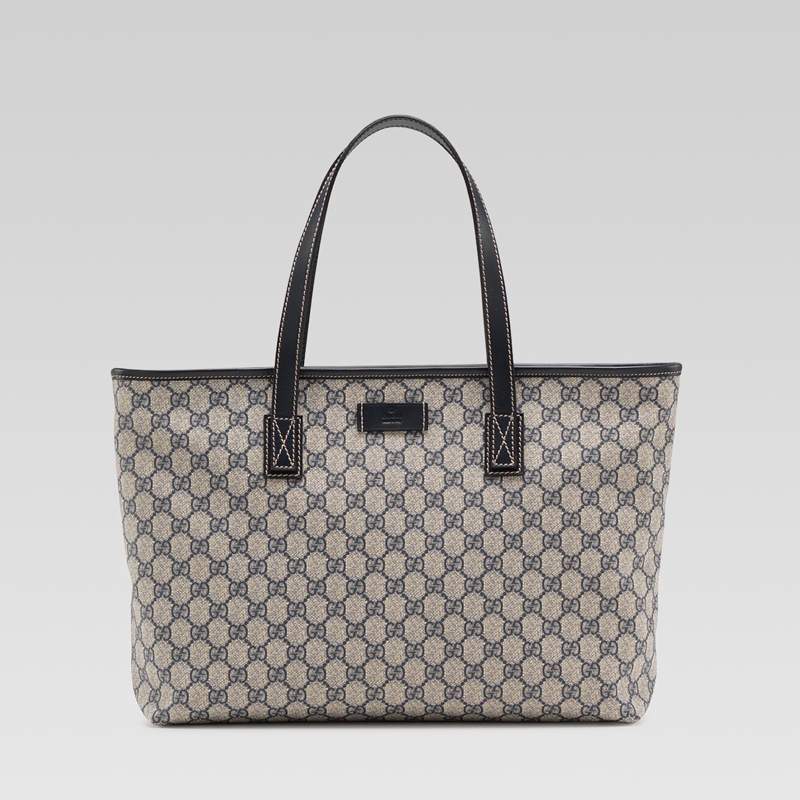 - beige/blue GG plus with navy leather trim - nickel hardware - double shoulder straps - zip-top closure - inside pocket