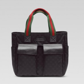 - black GG fabric with green/red/green signature web and black leather trim - double signature web handles - magnetic snap closure - double front flap pockets