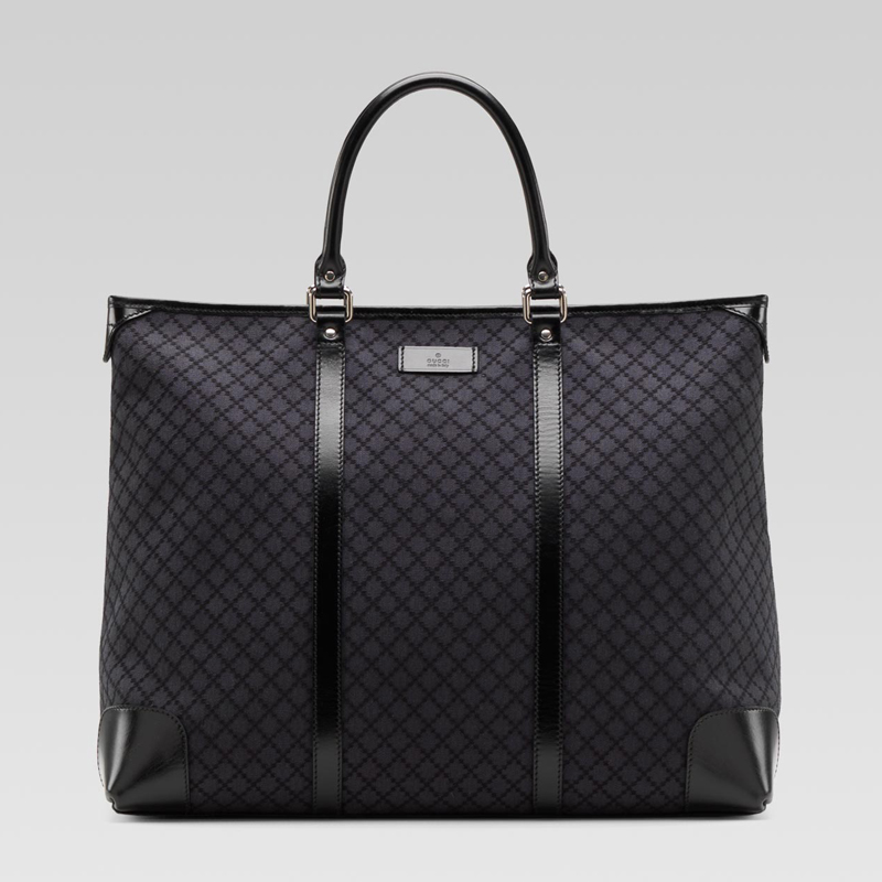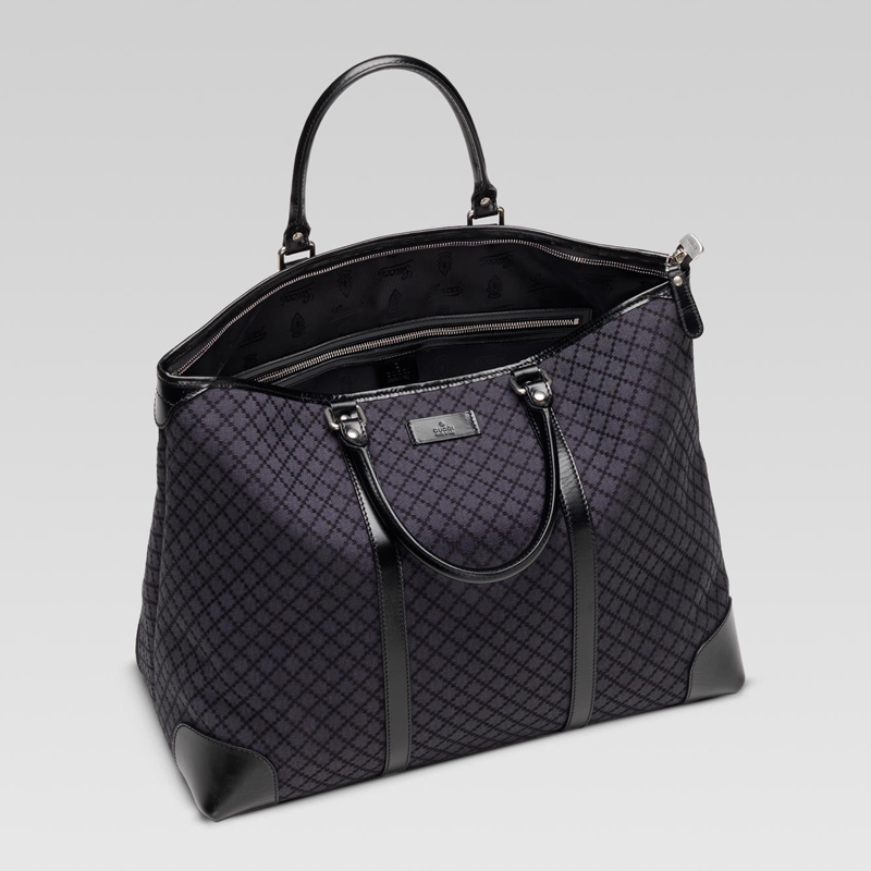 - dark grey/black diamante fabric with black leather trim - palladium hardware - double handles - zip-top closure - inside zip, mobile phone and pda pockets
