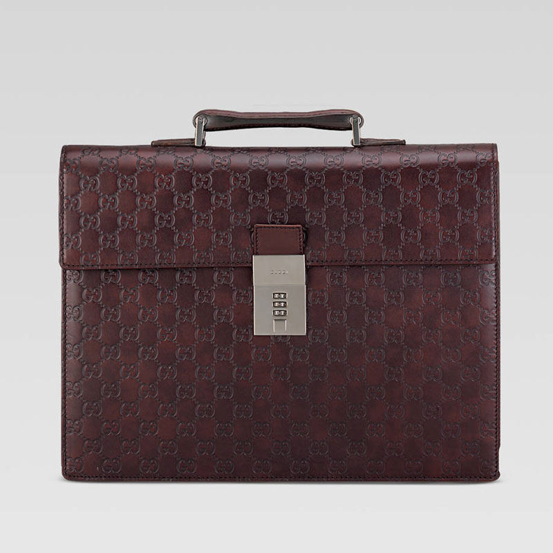 -chocolate guccissima leather-silver hardware-single handle-combination lock closure-single compartment-pen and business card holders
