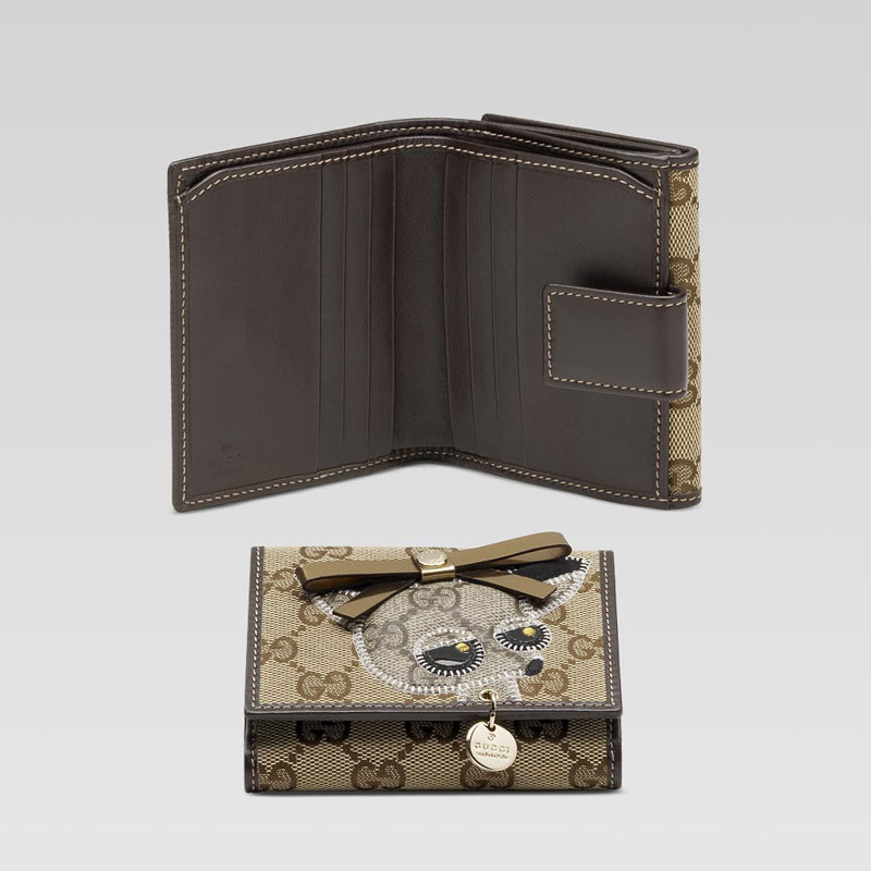 mini flap french wallet with 'brando' guccioli embroidery, bow, and gucci trademark charm.