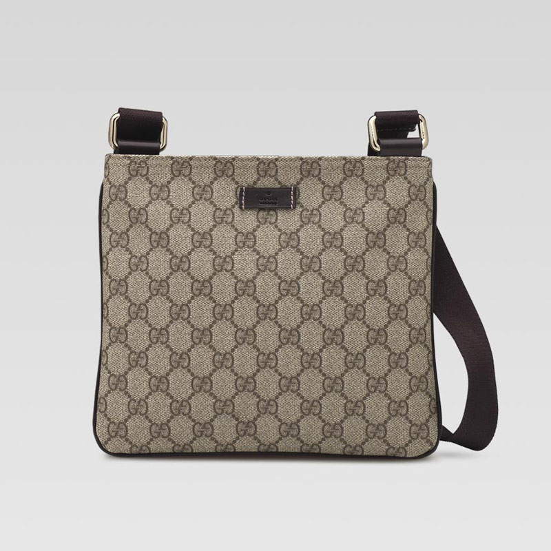 -beige/ebony GG plus with brown leather trim-light gold hardware-single adjustable strap-zip-top closure-inside zip and cell phone pockets