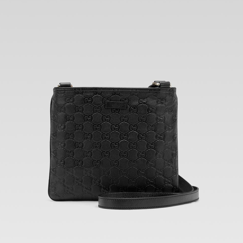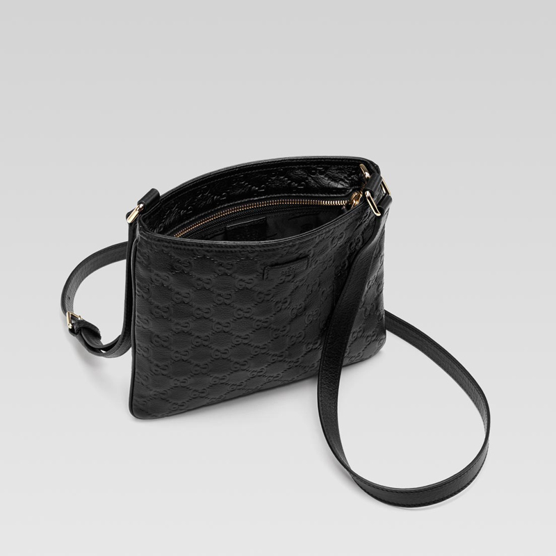 - black guccissima leather with black leather trim - light gold hardware - adjustable shoulder strap - zip-top closure - inside zip and mobile phone pockets Product ID: 201538 BEG1G 1000