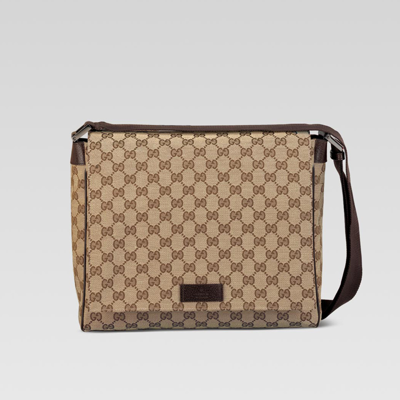 - beige/ebony GG fabric with dark brown leather trim - single adjustable strap - flap closure - inside zip pocket