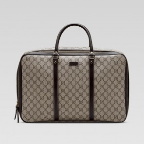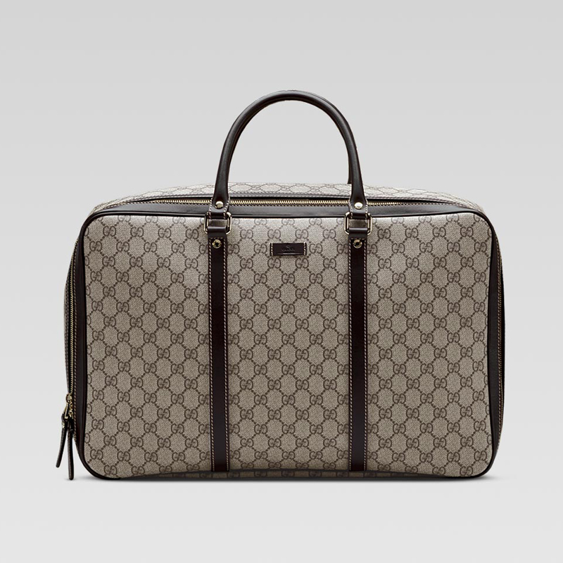 - beige/ebony GG plus with brown leather trim - light gold hardware - double handles - double zip closure with lock - identification tag - inside pocket with snap closure