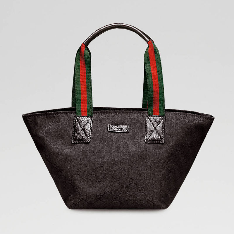 -black GG fabric with black leather trim-double handles in green/red/green signature web-zip-top closure