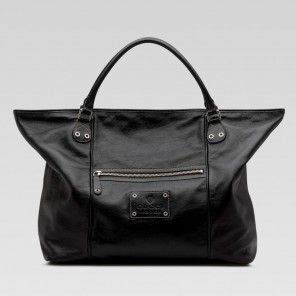 -black leather-silver hardware-double handles-zip-top closure -front zip pocket and inside zip and cell phone pockets