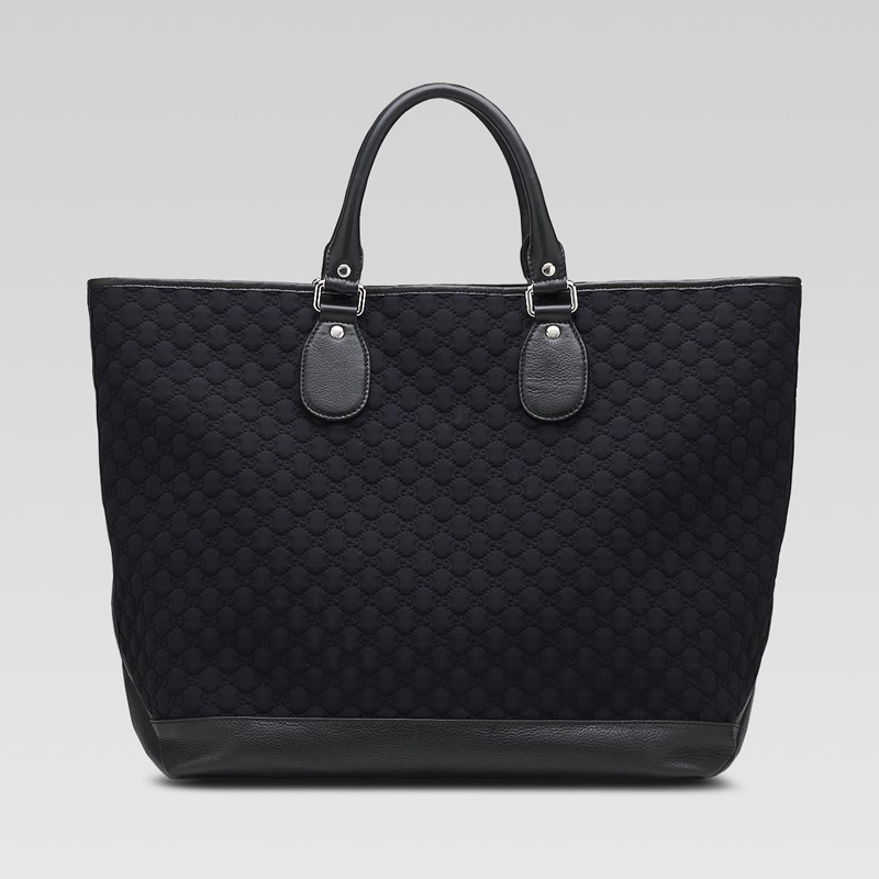 - black neoprene GG with black leather trim - rhodium hardware - double handles - interior hook closure - identification tag - bottom feet - inside zip, mobile phone, and pda pockets