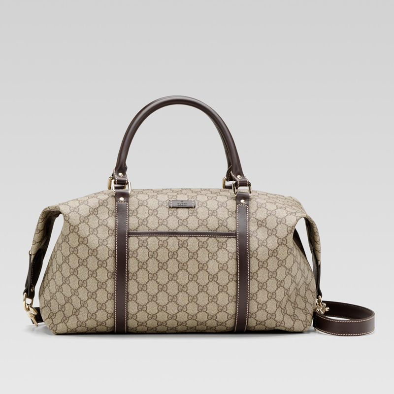 - beige/ebony GG plus with brown leather trim - light gold hardware - double handles and adjustable and detachable shoulder strap - zip-top closure - front pocket and inside pocket