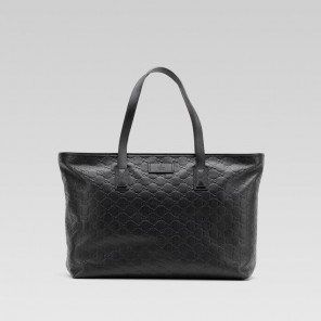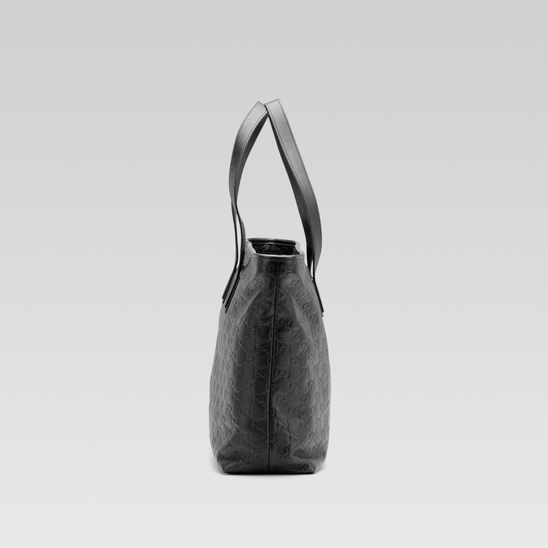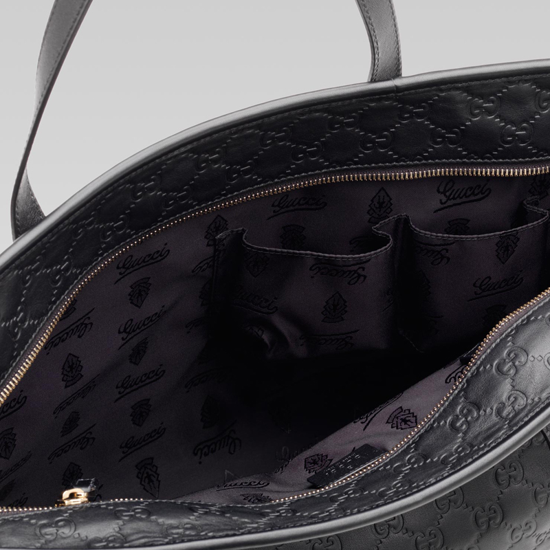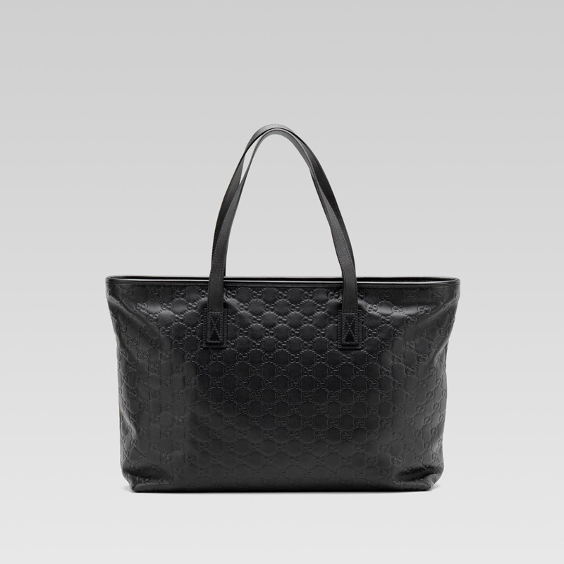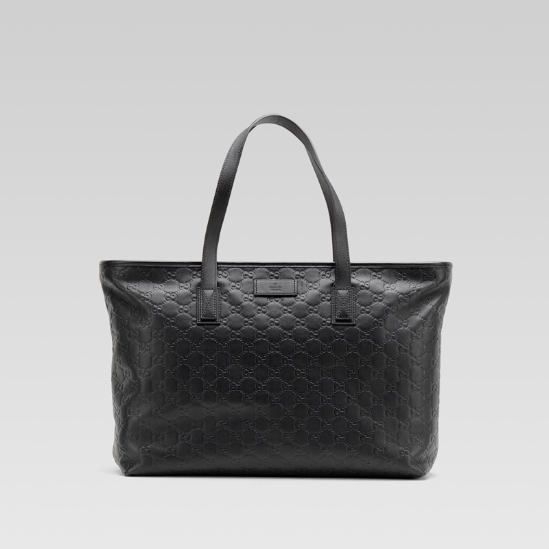 - black guccissima leather with black leather trim - gold hardware - double handles with 7.9" drop - zip-top closure - gucci trademark leather tag detail - interior pocket
