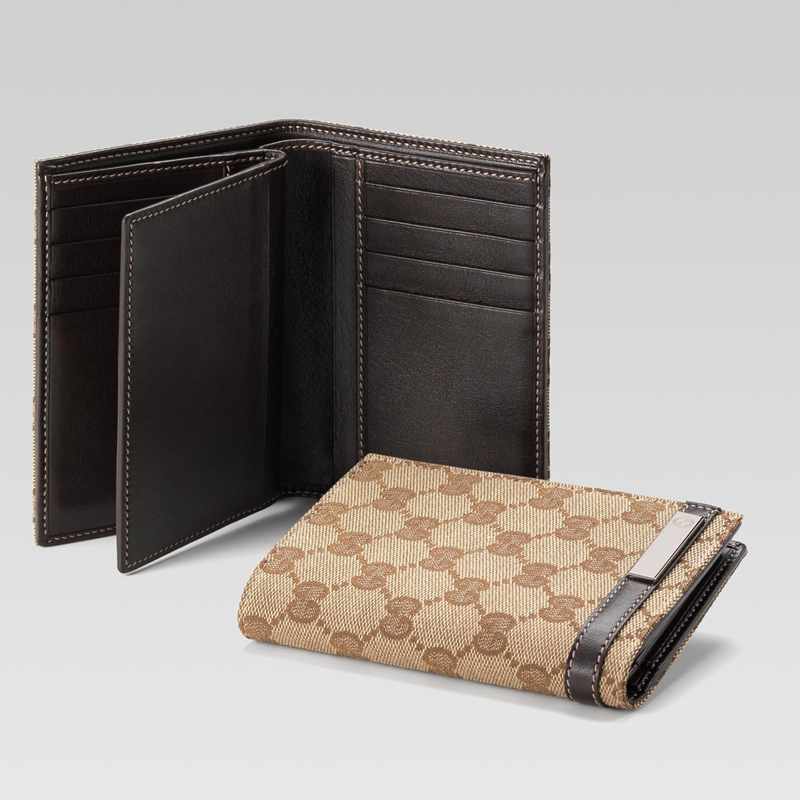 - beige/ebony GG fabric with brown leather trim/interior - ruthenium hardware - one page - twelve card slots and one bill compartment