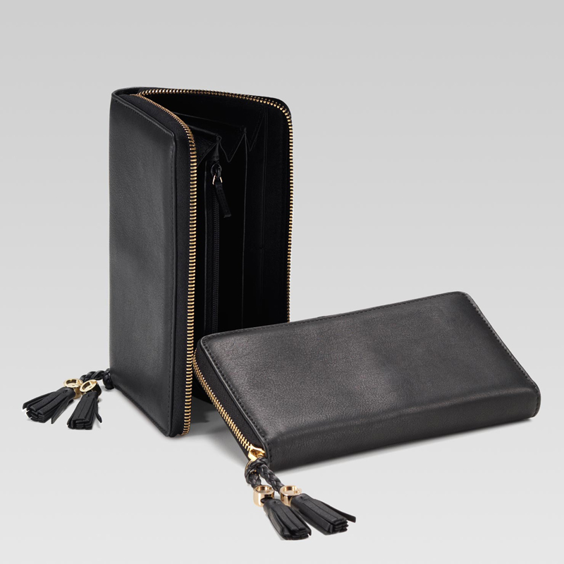 - black leather - light gold hardware - zip around closure - twelve card slots and three bill compartment - zip coin pocket
