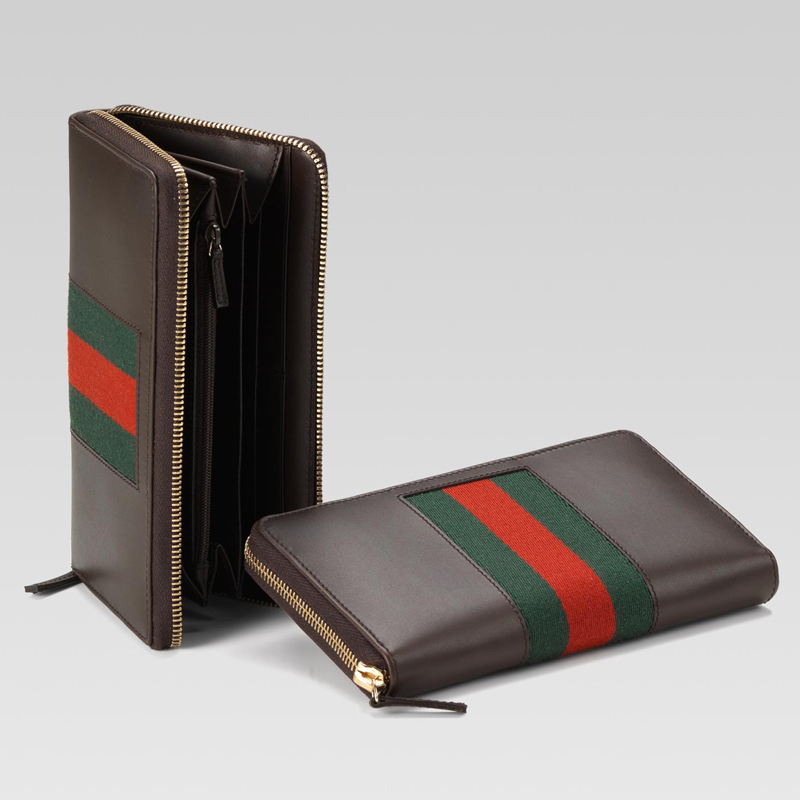 - brown leather with green/red/green signature web - zip around closure - twelve card slots and three bill compartment - zip coin pocket