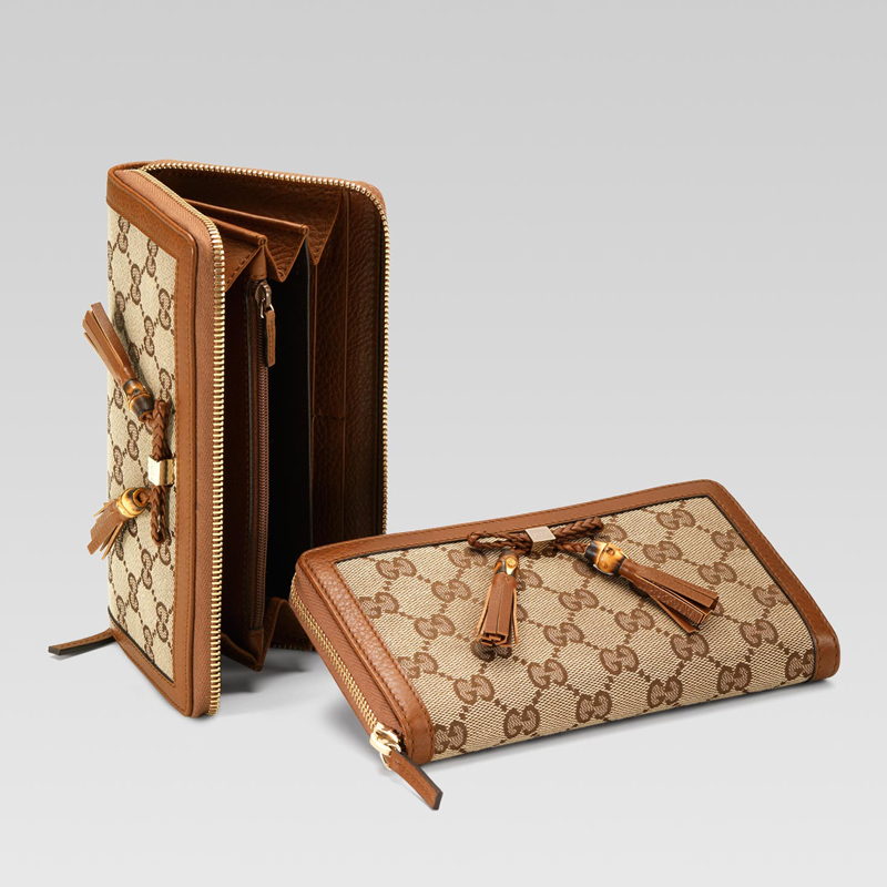 zip around wallet with woven leather bow, bamboo detail and tassels.