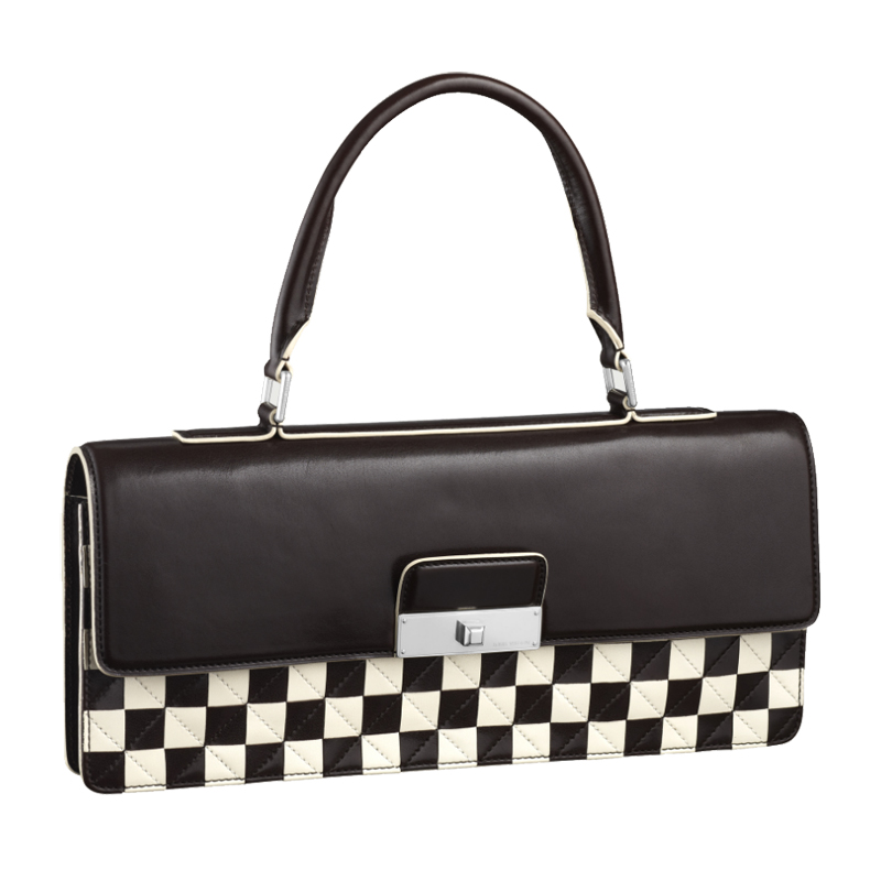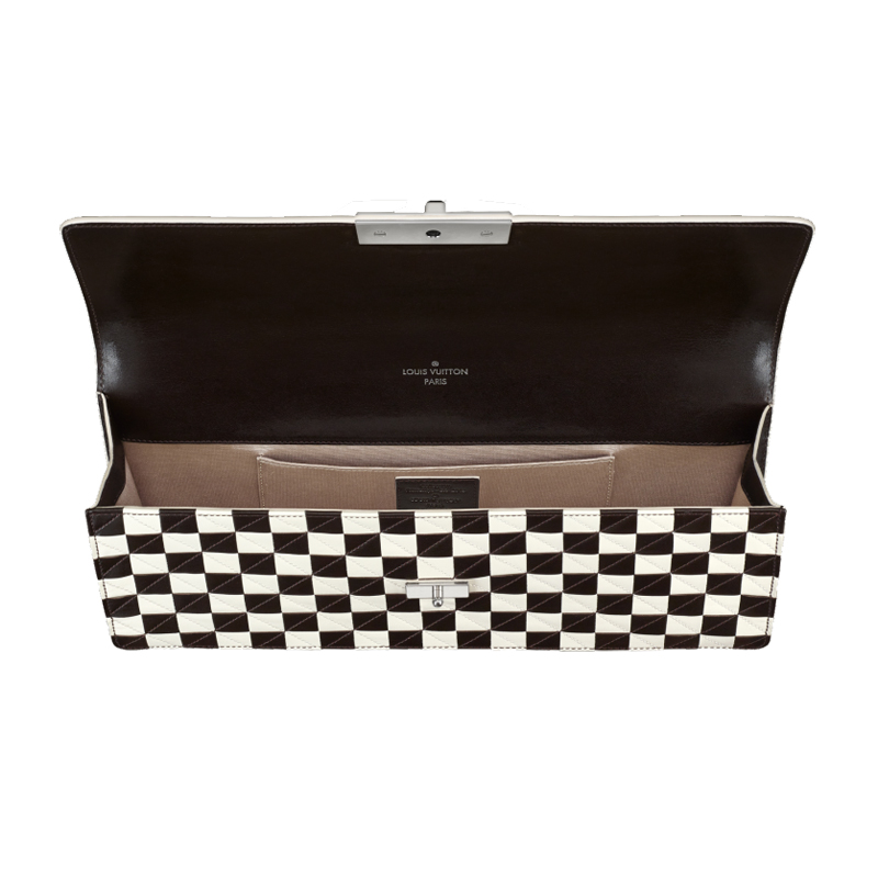 One of the standout looks of Louis Vuitton's Spring/Summer 2013 women's fashion show, the Enveloppe East West bag in Damier Mosaic nods to the graphic spirit of the Sixties. Its apparently simple design is the result of elaborate craftsmanship: strips of calfskin in two different colors are woven by hand, then overstitched to create a quilted effect which contrasts with the plain calf leather flap.