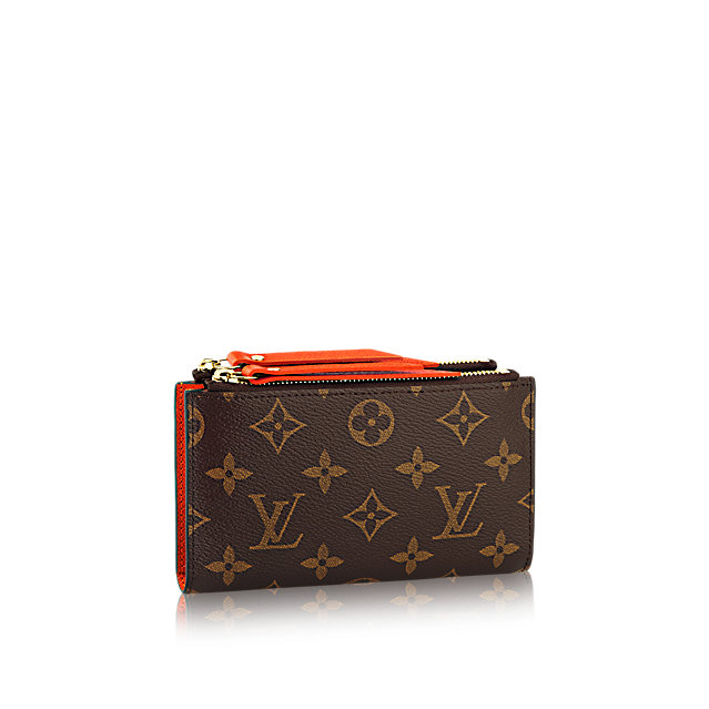 Combining Louis Vuitton's iconic Monogram canvas with a brightly colored leather lining, the stylish Adele compact wallet has a modern, slim-line design with two leather zippers and a magnetized button for easy opening. It will slip into any small city bag.