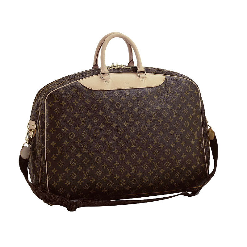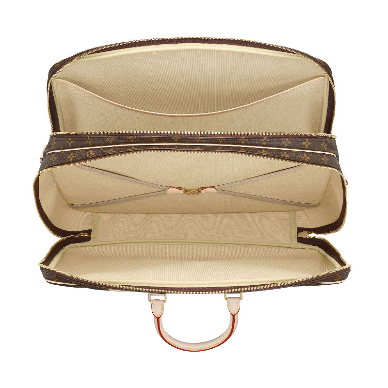 - Monogram canvas, natural cowhide leather, canvas lining with two double-zip compartments